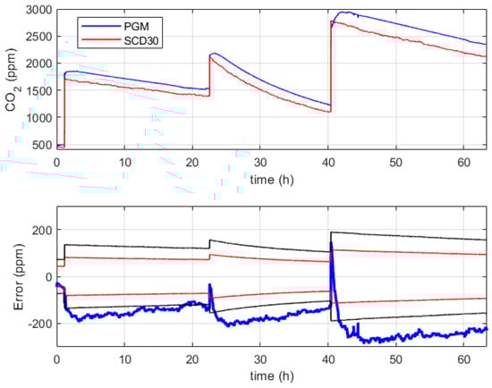 Tiele et al. [] tested the temperature, humidity, and carbon dioxide sensors against the CO210 Extech commercial system for one hour in a laboratory environment. Based on measurement results, they adjusted the temperature and CO2 readings by 1.9 °C and 70 ppm, respectively. Then, they did a baseline calibration of the device, putting it and the CO210 inside a sealed plastic enclosure and exposing it to zero air.