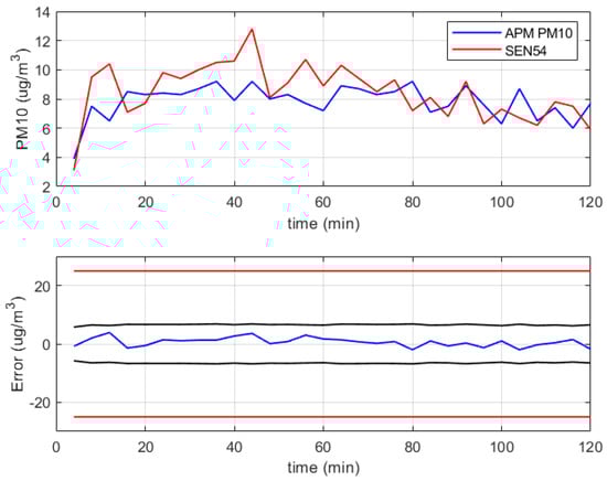 Measurements were carried out in a closed room located on the third floor of a building within the Politecnico di Torino. The room was not accessible to any person during the measurement period, and the door was kept closed. The instrument APM-2 was positioned above a desk, and the sensor was placed next to it. Before starting the measurement, the APM-2 was cleaned, and the filter was controlled to check the proper functioning. The test lasted about two hours, and the sampling rate of the APM-2 was two minutes, switching automatically from PM2.5 to PM10. The low-cost sensor sampled one data point/minute.