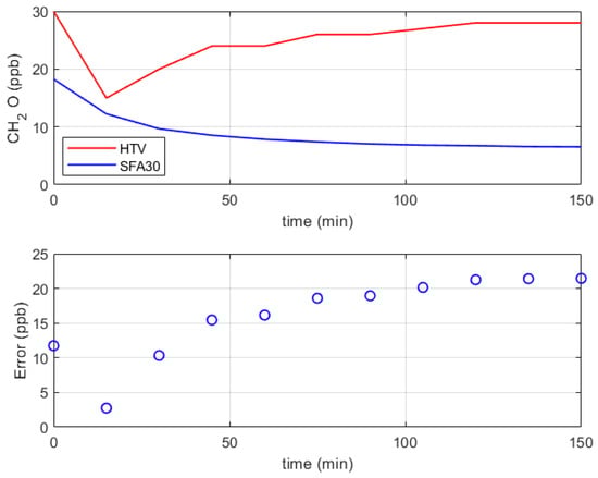 Formaldehyde (CH2O) is a transparent toxic gas with a pungent odor, and the WHO stipulates that the indoor formaldehyde content should not be higher than 0.08 ppm []. An electrochemical sensor was installed in the PROMET&O multi-sensor to measure this parameter. This typology of the sensor can have high selectivity and accuracy []. However, crafting sensors capable of accurately measuring formaldehyde levels at low concentrations has proven to be complex. Numerous factors influence formaldehyde concentration indoors, resulting in fluctuations in its emission. Apart from material properties, it is also correlated with indoor temperature, humidity, and ventilation rate. The signals of electrochemical sensors can be influenced by temperature and relative humidity [,]. The Sensirion SFA30 formaldehyde sensor was calibrated by comparing its readings to those of the Formaldemeter htV-M, manufactured by PPM Technology. The htV-M device is specifically designed for precise monitoring of low levels of indoor pollutant gases, with a focus on formaldehyde vapors, across various temperature and humidity conditions. It can accurately measure formaldehyde concentrations in both parts per million (ppm) and milligrams per cubic meter (mg/m3). The Formaldemeter htV-M adheres to ISO 9001:2015 [] quality standards and CE regulations, ensuring its reliability and accuracy in measurements []. Specific filters were added to the instrument to filter out phenols intentionally, ensuring that only formaldehyde was measured accurately. These filters were directly installed at the instrument’s sampling point. The formaldehyde sensor was positioned close to the calibrated htV-M formaldemeter, near its intake port. The measurements took place in a secured room located on the third floor of a building in Politecnico di Torino. Throughout the measurement, the temperature and humidity remained stable. The formaldemeter was programmed to sample data every 15 min, while the low-cost sensor collected data every minute. The measurements lasted for 150 min.