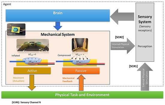 Diagram of the robot principle: the system designed can perceive the environment as a sensor and actuate in the environment as an actuator using an integrated soft body. The internal mechanical feedback from the body can be combined with external physical stimulation representing a redundancy of the sensory channels, improving the speed and simplifying the perception. The information processed by the perception module can go to the brain and activate the actuator part of the system, but it also can be processed in the sensory-motor coordination module without necessarily passing through the brain, speeding up the dynamic control of the robot.
