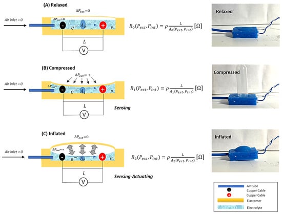 Diagram of the principle of functionality regarding soft sensory-motor system based on ionic solution. Three states of the SSMS-IS can be observed, i.e., (A) relaxed, when there is no air inlet in the system and the external pressure is null ; (B) compressed, when there is no air inlet in the system and there is an external pressure in the system; and (C) inflated, when there is air inlet in the system and the external pressure is null . For each state, differences can be observed in the electric resistance measurement for a determined voltage (V) based on the variation in the ionic solution area and distance between the positive and negative cupper cable. The variation in the ionic solution area is correlated with the variation in external pressure and internal pressure .