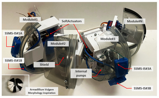 The design of the robot’s shield was bioinspired and was based on the morphology of the terrestrial isopod Armadilium Vulgare, which has a total of 8 segments, allowing the execution of a coordinated movement during conglobation. Based on this, as shown in Figure 4 and Figure 5, the proposed system was formed by modules that represent the bioinspired segments, and the robot body incorporates two rectangular SSMS-ISs mounted on the surface shield. Bioinspired robot design based on the morphology of the isopod Armadilium Vulgare: it was formed by modules that represent the bioinspired segments and each segment of the soft robot should have a sensory motor based on the SSMS-IS to actuate in the environment when expanded and to sense when compressed. Also, it can execute the conglobation movement for self-protection using soft actuators in each segment.