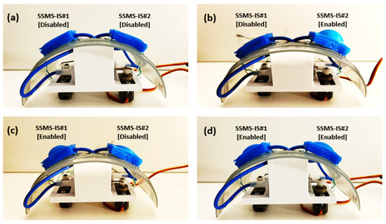 Robot morphology adaptation. From Table 1, (a) State 1, when both SSMS-ISs in the soft robot shield are disabled; (b) State 2, when one SSMS-IS is enabled; (c) State 3, when one SSMS-IS is enabled; and (d) State 4, when both SSMS-ISs are enabled.