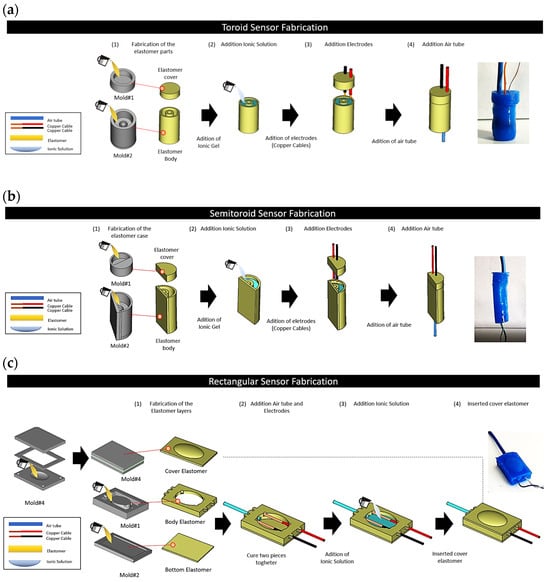 Figure 8 shows the SSMS-IS fabrication procedure for each proposed design. The silicon rubber component was cured in each 3D-printed mold, and the ionic conductive solution was filled into each prototype. Afterwards, copper wires were inserted into the cover body to form an electrical connection. Also, a thin flexible tube of 2 mm in diameter was inserted in each prototype to allow the air inlet in the sensor. At this point, the main container bodies were sealed with the cover layer using the uncured silicon rubber as a glue, resulting in a layer to seal the air inside the system.