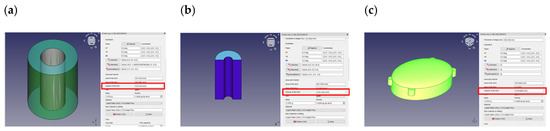 As shown in Figure 9, to guarantee the same comparison between the three soft motor sensors, each mold was designed with the same volume of electrolyte equal to 1.27 mL. The calculation was performed in the FreeCad software, version 0.20.2, using the macro FCInfo.