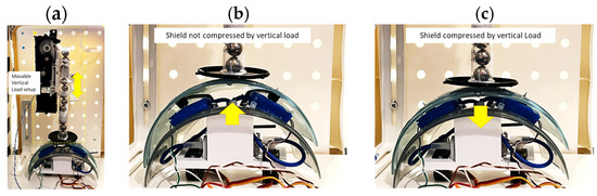 (a) Setup to test the response of both sensors simultaneously on the interface for external force input in the vertical direction as shown by the yellow arrow; (b) robot without external input force; and (c) vertical load pressing the shield in the vertical direction as shown by the yellow arrow in the picture, emulating an external input force over the robot.