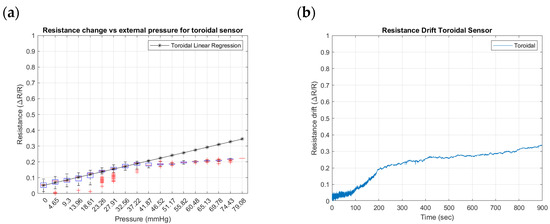 Resistance changes vs. pressure for toroidal geometry of the sensor: (a) sensitivity within the sensing range of external pressure of 0–79.08 mmHg and (b) drift in toroidal sensor for approximately 15 min.