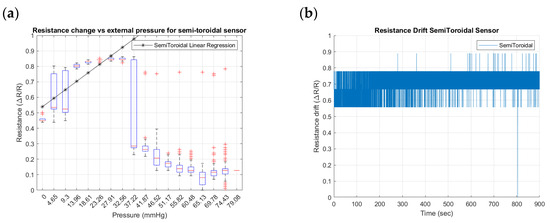 Resistance changes vs. pressure for semi-toroidal geometry of the sensor: (a) sensitivity within the sensing range of external pressure of 0–79.08 mmHg and (b) drift in semi-toroidal sensor for approximately 15 min.