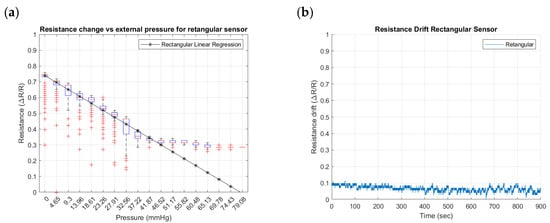 Resistance changes vs. pressure for the rectangular geometry of the sensor: (a) sensitivity within the sensing range of external pressure of 0–79.08 mmHg and (b) drift in rectangular sensor for approximately 15 min.