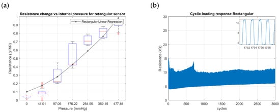 Resistance changes vs. internal pressure for rectangular geometry of the sensor: (a) sensitivity within the sensing range of external pressure of 0–477.81 mmHg and (b) results of cyclic loading of the sensor for 3000 cycles of internal pressure at 224.61 mmHg.