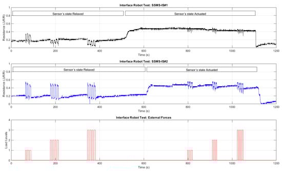 As shown in Figure 21, the robot performs in two types of states: relaxed and actuated. Three levels of force loads are applied over the interface for each robot state. The level of each force load is monitored for the variation in the resistance for each SSMS-IS in the shield for both robot states: relaxed and actuated. As shown in Figure 17a and Figure 20a, the variation in the SSMS-IS resistance has a linear response with the input pressure applied over and inside the SSMS-IS. Then, the robot response in Figure 21 indicates that the robot can monitor the impact of external forces in both states of the robot.
