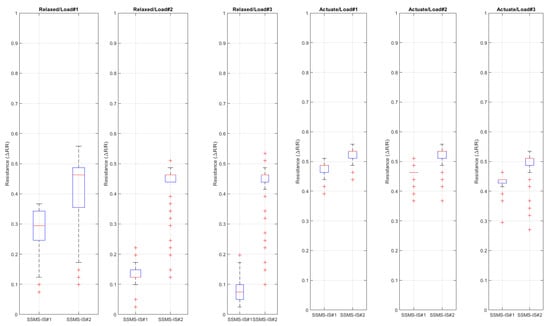 Boxplot for the soft robot response for each load applied in each performed state. For the relaxed state, each SSMS-IS in the robot could detect the external loads by the variation in the electric resistance. Also, when the value of the load was increased, the variation in the resistance proportionally increased. For the actuated state, each SSMS-IS in the robot could also detect the external loads by the variation in the electric resistance. When the value of the load was increased, the variation in the resistance also proportionally increased, indicating that in both states, relaxed and actuated, the robot can measure different external load values, and the variation in the internal resistance is proportional to the variation in the load.