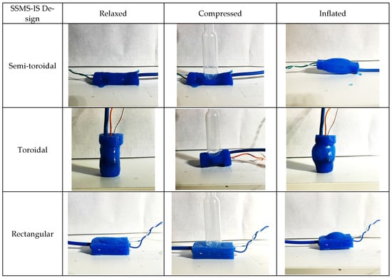 Mechanical deformation for each system design (toroidal, semi-toroidal, and rectangular) for each state of the system: relaxed, compressed, and inflated. The differences in the mechanical elasticity constraints for each SSMS-IS design can be noticed during the states of expansion and compression.