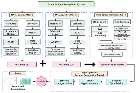 This study has developed an extensive system that includes embedded acquisition hardware, sophisticated host computer software, and carefully designed experiments for capturing raw signals. Through a series of steps encompassing data preprocessing and feature extraction, data derived from multimodal feature fusion are input into a refined gcForest algorithm-based fatigue recognition model. The application phase utilizes experimental data to validate the model’s effectiveness. The schematic diagram of the basic architecture of the system is depicted in Figure 1.