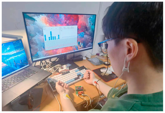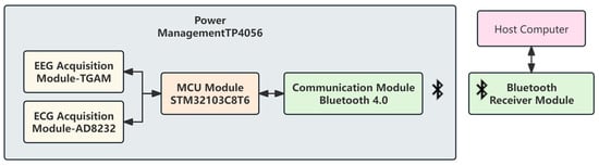 The system power supply module is tasked with the system’s power supply needs. It interfaces with the acquisition module which, upon capturing human body signals, utilizes the MCU for initial data preprocessing. The data are then transmitted to the host computer via the communication transceiver module for further processing. The hardware system’s design, as physically depicted in Figure 4, emphasizes a small, compact, and portable form factor.