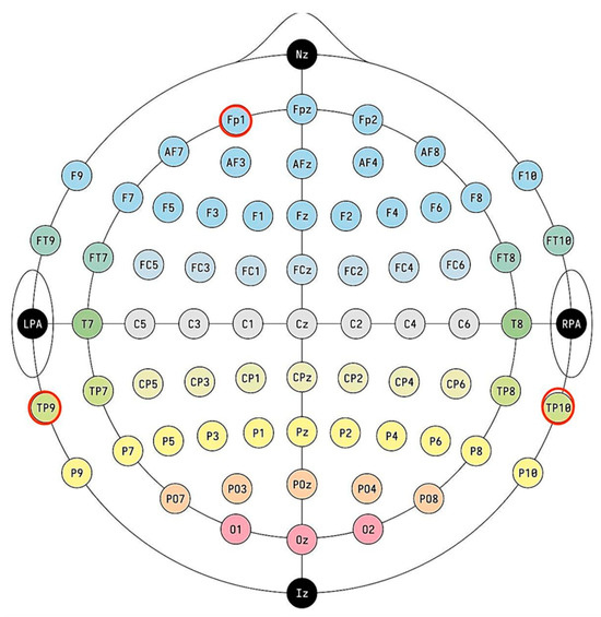Some studies have shown that selecting a specific single-channel EEG can achieve up to 96.6% recognition accuracy, indicating the effectiveness of single-channel EEG in fatigue recognition [22]. Therefore, in order to facilitate the operation and reduce the cost of development, this paper uses a noninvasive dry electrode acquisition method that is more suitable for daily monitoring and portable devices. Referring to the International Electroencephalogram Society’s calibrated 10/20 electrode lead positioning standard, the EEG acquisition electrode was placed at a specific sampling point (Fp1) at the left forehead, which is usually not covered by hair [23], and the left ear (TP9) and right mastoid (TP10) were used for the reference electrodes, as shown in Figure 3. Then, the differential signals from the EEG electrode and the reference electrode were transmitted to the TGAM chip for signal processing.