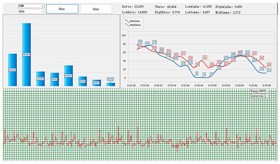 EEG and ECG data collected by the system’s hardware are conveyed to the Bluetooth communication module through serial communication. The acquired data are then instantly relayed to the WinForms-developed software (version 1.0). The software’s interface, as depicted in Figure 5, facilitates the real-time visualization of various parameters, such as the wave amplitudes for the EEG and ECG signals across crossover bands. Additionally, this set-up permits instant storage of the data, which aids in the creation of a sample dataset pivotal for evaluating cerebral fatigue.