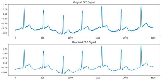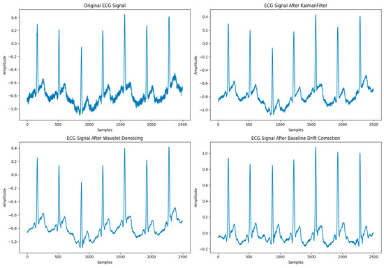 The original ECG signal was initially subjected to Kalman filtering to remove random noise, followed by a discrete wavelet transform (DWT), where the signals underwent multi-level wavelet decomposition. Noise components were eliminated based on predefined thresholds, and the signal was then reconstructed. After denoising, the signals were further processed for baseline drift correction to eliminate low-frequency drifts caused by respiration or limb movements, and the denoised ECG signal was obtained as shown in Equations (1) and (2):