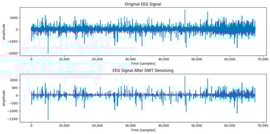 By utilizing a DWT coupled with soft thresholding, the wavelet basis and scale function of the adapted processed signal were set, and the denoised EEG signal was taken out through signal reconstruction as shown in Equation (14):