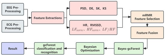 Thus, as an alternative to deep learning, the multi-granularity cascade forest (gcForest), a model renowned for its excellent generalization on small sample datasets, was proposed [15]. It is based on the principle of bringing together multiple random forests of different types to make a joint decision on classification by majority voting, and this integrated approach substantially improves the generalization ability of the model. Currently, gcForest has been applied to some brain fatigue recognition tasks based on physiological signals. For instance, Fang et al. [16] computed the multi-class features of EEG signals and used gcForest as a classifier for emotion recognition, which improved the recognition accuracy by up to 19.53% compared with the traditional machine learning methods. Yan et al. [17] proposed an EEG rhythmic feature-based optimized deep forest emotion awareness recognition method, using the gcForest classification model for emotion recognition, which achieved 96.711% classification accuracy on the DEAP dataset, and also pointed out that the classification accuracy of multi-feature fusion is significantly higher than that of the single-feature method.