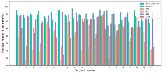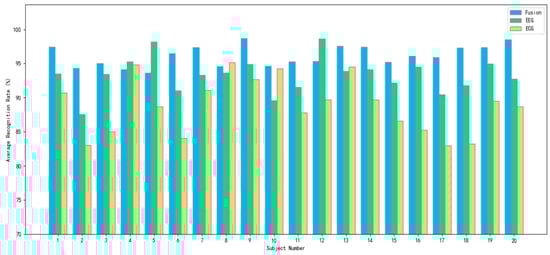 To obtain a better visualization of the impact of different models on each subject’s data, Figure 27 shows the average recognition rates obtained by the models using different modal features for the 20 subjects’ data.