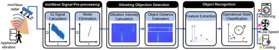 Previous studies [16,17] have typically utilized the Doppler effect to detect vibrating objects. However, in indoor environments, the Doppler effect from human motion is often much larger than that from appliance vibration. Therefore, in real-world environments, the Doppler effect from appliance vibration may be masked.