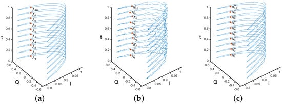 (a) Ideal periodic signal in the IQ domain; (b) Periodic signal with random noise in the IQ domain; (c) Signal obtained by specific averaging of the signal in (b). From point to point , from point to point , and from point to point , the time interval is a period.