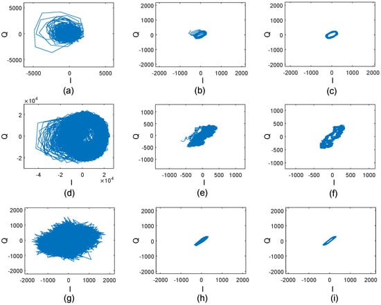 (a–c), (d–f), and (g–i) show the IQ domain signals of the air conditioner, fan, and refrigerator, respectively. (a,d,g) represent the original signals. (b,e,h) represent the signals after the elimination of random noise. Finally, (c,f,i) represent the signals after the elimination of both random noise and baseline drift.