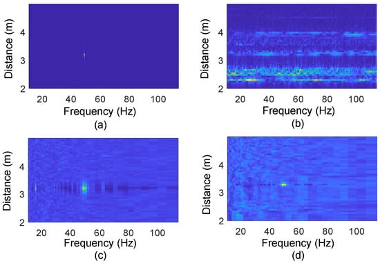 Figure 6a,b demonstrates the Doppler spectrum obtained from vibration detection of a refrigerator with radar in the absence of any interference and in a scenario where someone is walking around, respectively. It is obvious that the energy caused by the walking person masks and drowns out the energy corresponding to the vibration of the refrigerator. Consequently, a new metric that allows robust vibration detection against interference needs to be proposed.