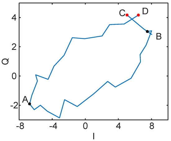 For the periodic signal, we observe that the distance between two points in the IQ domain is related to the signal’s period. Specifically, the time interval between the farthest points is half a period, and the time interval between the closest points is one period. We also verify this characteristic of the periodic signal in practice, as shown in Figure 7. The time interval between A and B is half a period, and the time interval between C and D is one period. For points within a period, we can express the farthest distance and the average nearest distance using the following equations: