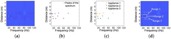In this section, we utilize the Vibration Intensity Metric to estimate the distances of all vibrating objects. Figure 9a illustrates the Vibration Intensity spectrum in distance and frequency for three electrical appliances. Notably, each appliance exhibits distinctive peaks at corresponding distances, which we can leverage to estimate the distances of all appliances. The overall algorithm is depicted in Figure 9 and Algorithm 1.