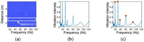 The process of feature extraction: (a) extract the Vibration Intensity spectrum within the range of each appliance; (b) extract the strongest Vibration Intensity at each frequency; (c) select the top-k optimal vibration frequencies; and, finally, take the optimal top-k frequencies along with their corresponding vibration intensities as the features for classification.