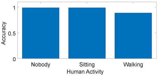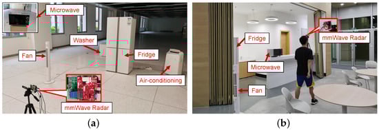 To further assess the practical application of our system, we conduct experiments in a real-world environment, as illustrated in the deployment setup shown in Figure 11b. We test the recognition accuracy under three scenarios: no individuals present, individuals seated, and individuals walking. It is worth noting that, to mitigate any potential blockage of mmWave propagation between appliances and the radar during human movement, we employ a 10 s sliding window during the recognition process, as described in Section 3.4.2 of the field.