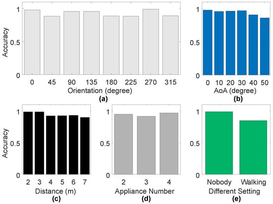 Performance of different micro-benchmarks. (a) Performance with different orientations; (b) Performance under different AoAs; (c) Performance under different distances; (d) Performance under different numbers of appliances; (e) Performance under the interference of walking.