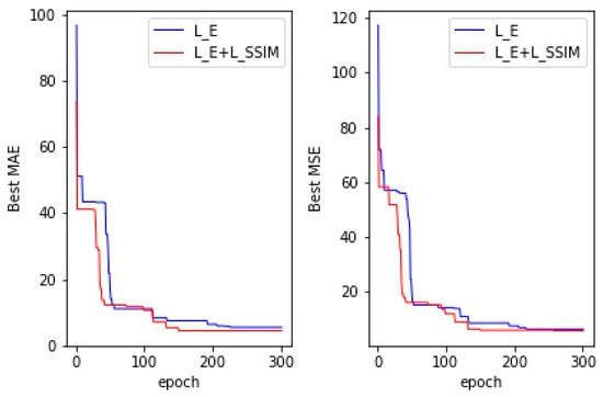 In addition, to improve the convergence speed of our proposed model, we also conducted ablation experiments on the loss functions; Table 6 shows the loss functions used in our training of the SFCNet. We compared the results of training the model using the Euclidean loss function with the results of using both the SSIM loss and the Euclidean loss functions. Figure 6 shows the MAE and RMSE of the validation set of the SFCNet converged with the use of different loss functions. As shown in Table 6 and Figure 6, the SFCNet using Euclidean loss as well as SSIM loss not only obtained a better counting performance, because the structural similarity loss pays more attention to the finer-grained counting errors in the image, but also converged faster; thus, it was able to find the global optimal solution.