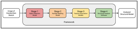 Future work may also involve extending the proposed framework to other structural systems, such as truss and frame structures. In this regard, the modular nature of the framework will make creating these new systems straightforward. The proposed design also allows for certain software modules in the system, including the number-reading model and certain MLPs (e.g., the load–number and length–number models) to be reused. Moreover, it allows for other software modules, such as the object detection model and certain MLPs, including the beam–support and the element–length models, to be effortlessly adapted to analogous tasks by simply adding new training data. Additionally, this general framework has the potential for interdisciplinary applications to other engineering problems. By simply obtaining the requisite training data and retraining each machine-learned model, this framework can be applied to new domains. For example, systems may be developed to recognize and analyze hand-sketched free body diagrams in mechanical engineering or to recognize and analyze handwritten circuit diagrams in electrical engineering.