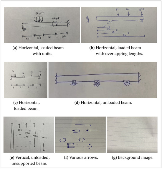To recognize the features that commonly appear in beam diagrams, the model is trained on a fully custom-made dataset of 650 images depicting hand-drawn beam diagrams and other pertinent features (Figure 3). Specifically, the model is trained to recognize beams themselves; fixed, roller, and pin support conditions; handwritten numbers; annotated dimensions of beam elements; concentrated moments applied either clockwise or counterclockwise; right-, left-, upward-, and downward-applied point forces; and right-, left-, upward-, and downward-applied uniformly distributed forces. The separation of loads pointing in different directions into different object classes allows the model to accurately determine the direction of all applied loads. Following object detection best practices, 50 background images containing no objects of interest are included in the dataset in order to reduce the number of false positives returned by the model. All 700 images in the dataset (i.e., the initial set of 650 as well as the 50 background images) are created and labeled manually during the course of the project.