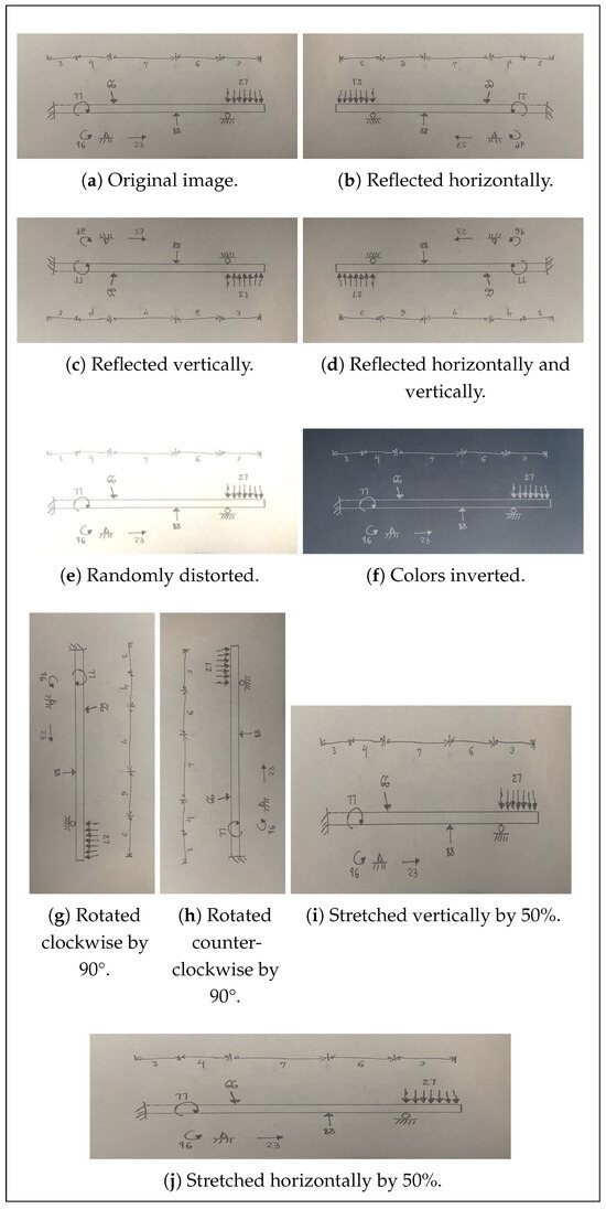 To further minimize adverse effects from the presence of any unintended patterns present in the training dataset, each image is augmented in nine ways, producing a labeled dataset of 7000 images. In the augmentation process, each image is rotated 90° clockwise; is rotated 90° counterclockwise; is reflected horizontally; is reflected vertically; is reflected both horizontally and vertically (both augmentations at once); is stretched by 50% horizontally; is stretched by 50% vertically; is subject to random distortions, such as blurring, brightness changes, and contrast changes; and is subject to color inversion (Figure 4). Image rotations and reflections serve to eliminate many of the unintended topological patterns that can appear by virtue of the manner in which diagrams tend to be drawn, making the model more generalizable to different engineers’ diagrams. These types of alterations also balance the counts of each direction of loads in the dataset, since reflections produce a counterpart pointing in each direction for each load drawn. Stretching and distorting the images, meanwhile, exposes the model to diagrams mimicking those sketched by different people. Color inversion, moreover, produces a light-colored diagram sketched on a black background, enabling the model to support the digitally generated diagrams commonly produced on tablets. Importantly, this augmentation procedure creates a sufficiently large dataset—7000 images—to properly train the model (Table 1). While it is recommended that YOLO training datasets contain as many as 1000 images and 10,000 instances per class for detection [12], the simple nature of the problem at hand allows for strong performance even with a smaller dataset. A small dataset for model validation containing 30 analogous, but separate, images is also created. Applying the same augmentation procedure results in a dataset containing 300 images, representing a 4.1%/95.9% validation–training split.