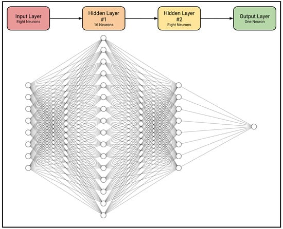 The first five MLPs map eight input variables representing the four corner coordinates of the bounding boxes of the relevant objects to one output variable. This output is a numerical value between 0 and 1 representing the likelihood that the relevant condition is true. To undertake this task, the model uses two hidden intermediate layers consisting of 16 and 8 neurons, respectively (Figure 8). Thus, these models have 289 parameters. Conversely, the “length–style” MLP takes 20 inputs corresponding to the four bounding coordinates of any five lengths present in the image in any order, but it still produces one analogous output indicating whether the lengths are overlapping or separated. This MLP employs two hidden layers with 32 and 8 neurons, respectively, making it a 945-parameter model.