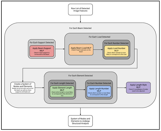 These MLPs are applied in a structured algorithm to convert the raw data extracted by the previous CV models into a format that can be further analyzed. More precisely, the goal of the algorithm is to translate a list of raw information about detected objects into a coherent beam data structure that encompasses all relevant information about the given beam system and that that can be easily incorporated into structural analysis software. Each structural model must contain exactly one beam, so each beam detected is considered separately by the algorithm. The step-by-step execution of the algorithm (Figure 9) is described below.