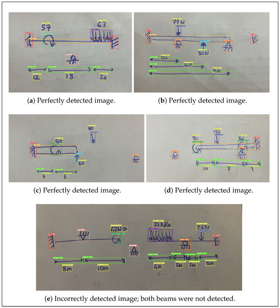 Visualization of results of complete model on testing dataset. Note that one number was read incorrectly in a correctly analyzed image, but that number represented the magnitude of a load that was not acting on the beam.