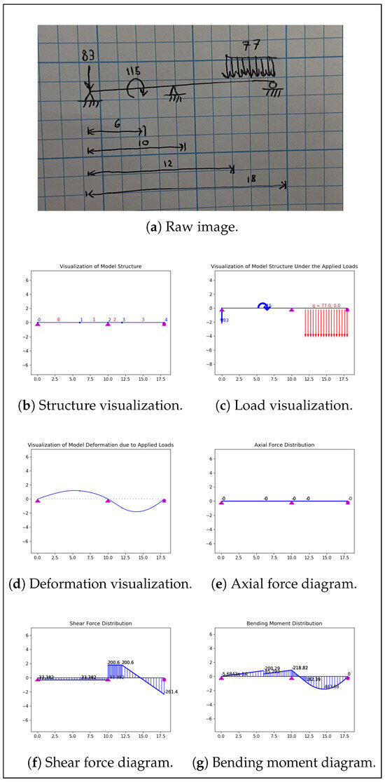 The fourth stage in the system is completed using OpenSees structural analysis software [40]. The same algorithm employed in the previous step converts the image features into a comprehensive beam data structure taking the form of a collection of nodes and edges. These are the structural nodes upon which loads and supports act and the structural elements of varying lengths that join them. These data are incorporated into OpenSees (OpenSees nodes are instantiated, positioned, fixed, and loaded appropriately for each beam node, and OpenSees elements are instantiated to join these nodes), producing an analyzable structural model. At this juncture, any desired structural analysis and visualization supported by OpenSees is carried out. Specifically, the model structure, loads, and deformation are visualized, and the beam’s axial force, shear force, and bending moment diagrams are plotted. This structural analysis provides useful information to structural engineers concerning the efficiency and viability of potential designs in an easy-to-understand format.