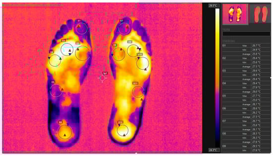 The same protocol was established for all sessions. The researcher placed the insoles on a black thermal screen to prevent heat from being diverted by surrounding people or objects. Photos were captured in an area devoid of reflective lights, with uniform lighting, and the camera was precisely aligned with the appropriate lens focus and visual settings adjusted. Thermal snapshots of the materials were obtained using a FLIR E60BX thermal camera, with the following specifications: (1) a pixel count of 76.800, (2) thermal sensitivity of 0.045 °C at 30 °C, (3) a temperature oscillation of −20 °C to 120 °C with an accuracy of ±2% or 2 °C, and (4) a spectral range of 7.5 μm to 13 μm. The camera was placed on a tripod one meter away from the black screen and the material. Three thermographic images (emissivity of 0.98; iron bow color palette) were taken before inserting it into the participant’s usual medical footwear (same brand and model: Medical Shoes Zale®, Alicante, Spain).