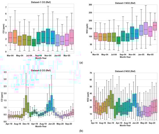 We have focused on the calibration of an LCS measuring two gas pollutants, CO and NO2, for this work. Both pollutants are components of the Air Quality Index (AQI) [39]. We have utilized three datasets collected by researchers using LCSs deployed in different parts of the world. Figure 1 shows the box plot of the target pollutant (CO and NO2) concentrations recorded by the reference sensors for all three datasets.