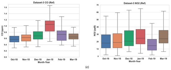 Box plots of the target pollutant concentrations as recorded by the reference sensors for Dataset 1, 2 and 3 in (a–c), respectively. The median and standard deviation of the CO readings are (1.66, 1.26), (0.49, 0.40) and (0.67, 0.25) in ppm, respectively, for the three datasets. The median and standard deviation of the NO2 readings for the three datasets are (109, 47.23), (18.16, 12.68) and (20.33, 15.65) in ppb, respectively.
