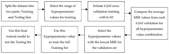 A portion of each dataset (training data) is used to determine the parameter of the calibration model by training and validating the regressor model. The performance of the trained model is then evaluated on the remainder of the data (testing data) not used for training. There are two common usage situations for an LCS. In one situation, a co-located low-cost sensor can be used as a backup in case the reference grade monitor is out of commission for a short period. To emulate this situation, we split each data set so that 90% of the data were used for training/validation and 10% of the data were used for evaluating the accuracy of the trained models. We term this as Train-Test Split 1 or TTS1. The second usage situation is using the LCS after calibrating the sensors through a relatively short co-location with a reference sensor. This is emulated by using 20% of the data for training/validation and the remaining 80% for evaluating the accuracy of the trained models. We term this as Train-Test Split 2 or TTS2. The train/validation/test process has been illustrated as a diagram in Figure 2.
