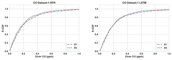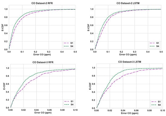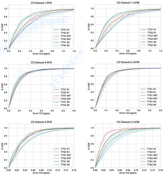 E-CDFs of CO for all three datasets for different algorithms between scenarios S0 (raw LCS + Temp + Hum), S0T (raw LCS + Temp + Hum+ Ndays + Hour), S1 (same as S1—raw LCS + Temp + Hum + other gases) and train test splits (TTS1—90:10, TTS2—20:80).