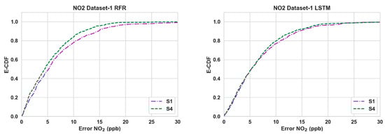 Figure 4. Empirical CDF plots of calibration error for NO2. - The target diagrams for the calibration are presented in Figure 5 and Figure 6. All the points lie inside the unit circle, i.e., radius = 1, and therefore the variance of the residuals is smaller than that of the reference measurements. Thus, the variability of the calibrated output (dependent variable) is explained by the reference data (independent variable) and not the residues. The distance of these points from the origin represents the normalized RMSE (RMSE/), which shows that calibrations achieved are more accurate than the same for S1. This once again underlines the importance of adding temporal data as input features. It is also observed that the standard deviation of the calibrated data is mostly smaller than the standard deviation of the ground truth, as the majority of the points lie on the left plane.