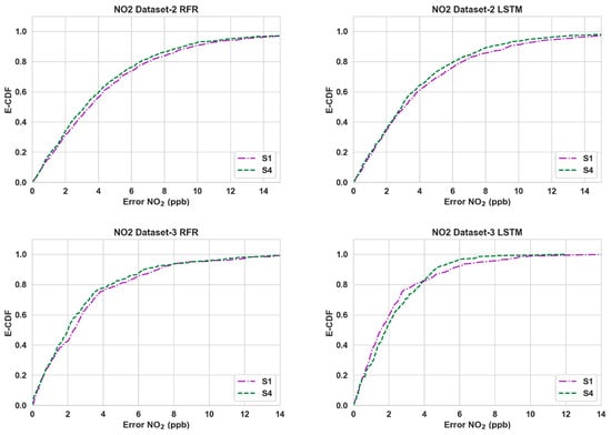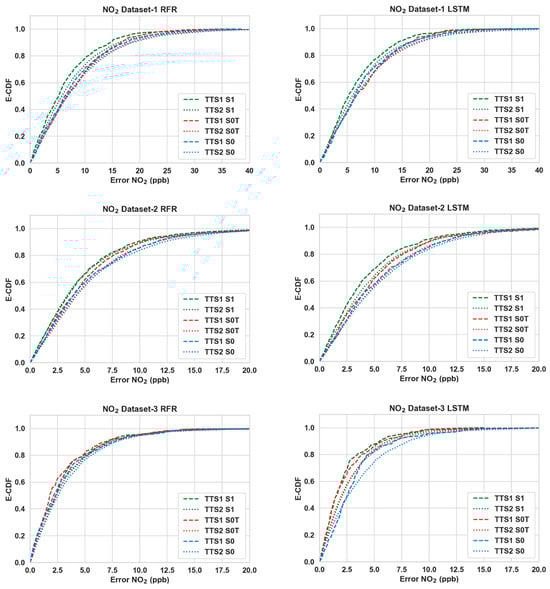 E-CDFs of NO2 for all three datasets for different algorithms between scenarios S0 (raw LCS + Temp + Hum), S0T (raw LCS + Temp + Hum+ Ndays + Hour) and S1 (same as S1—raw LCS + Temp + Hum + other gases) and train test splits (TTS1—90:10, TTS2—20:80).