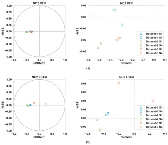 Figure 6. Target diagrams of (a) RFR and (b) LSTM for NO2.